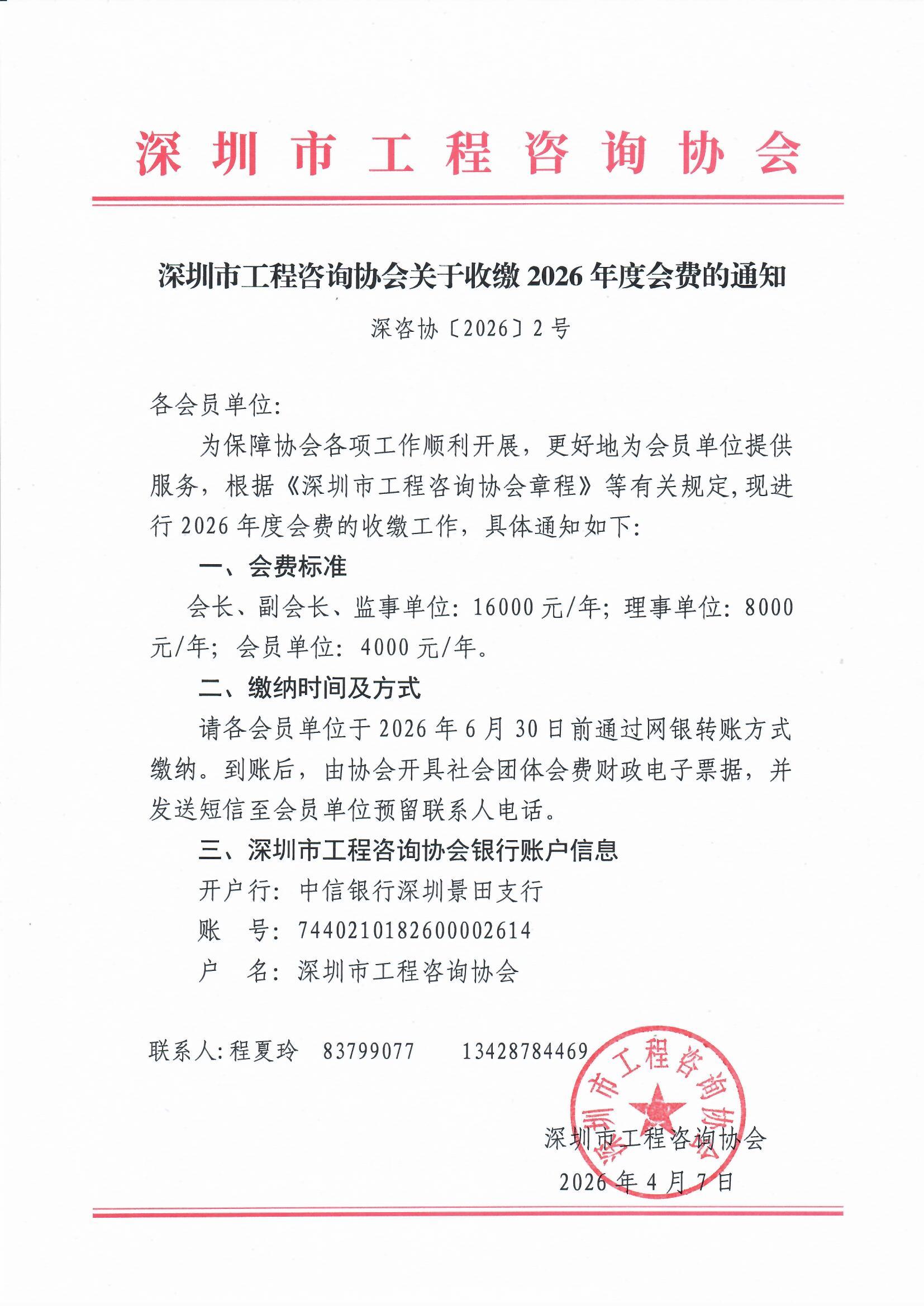 深圳市工程咨询协会关于收缴2026年度会费的通知