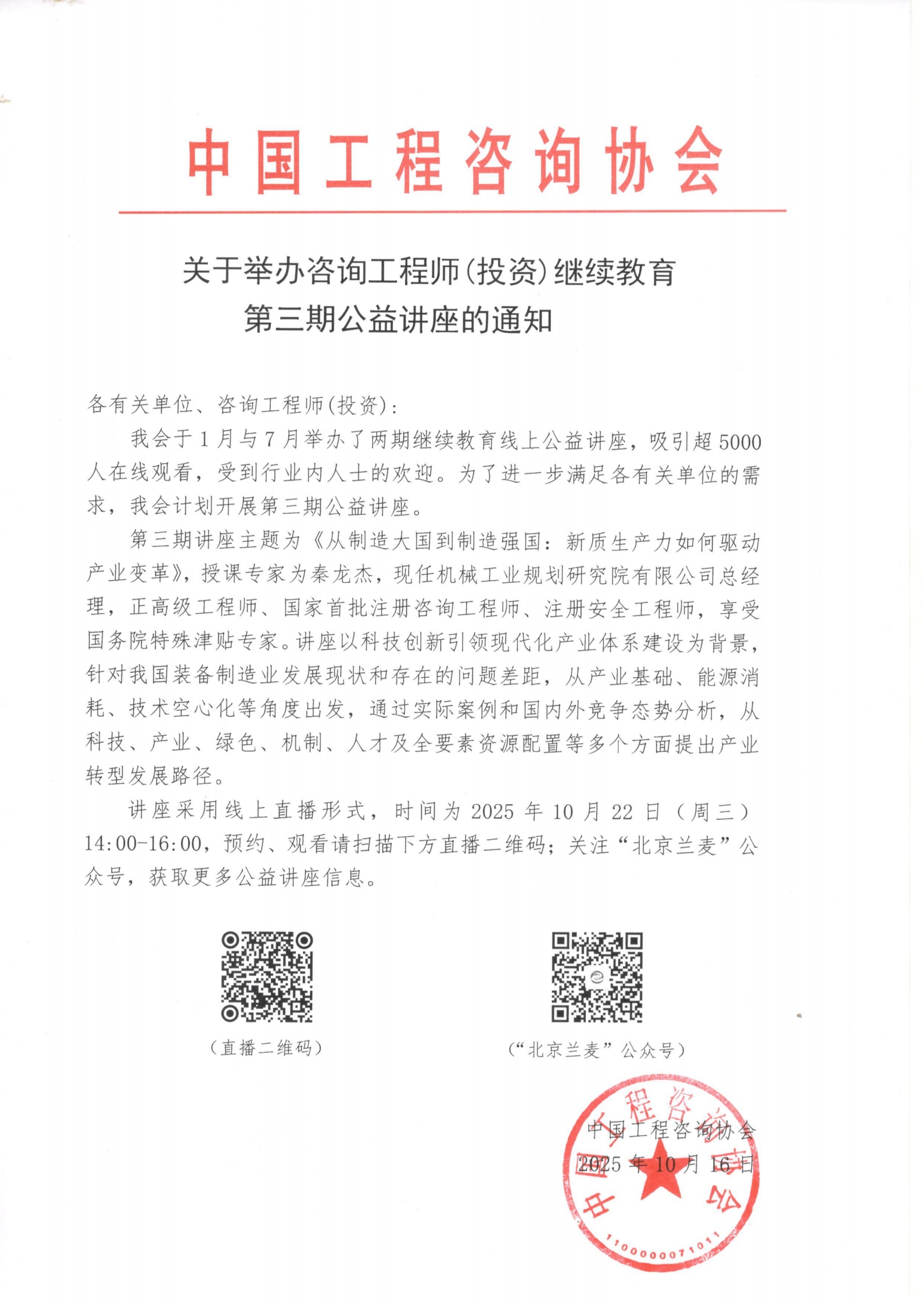 转发中国工程咨询协会关于举办咨询工程师(投资)继续教育第三期公益讲座的通知