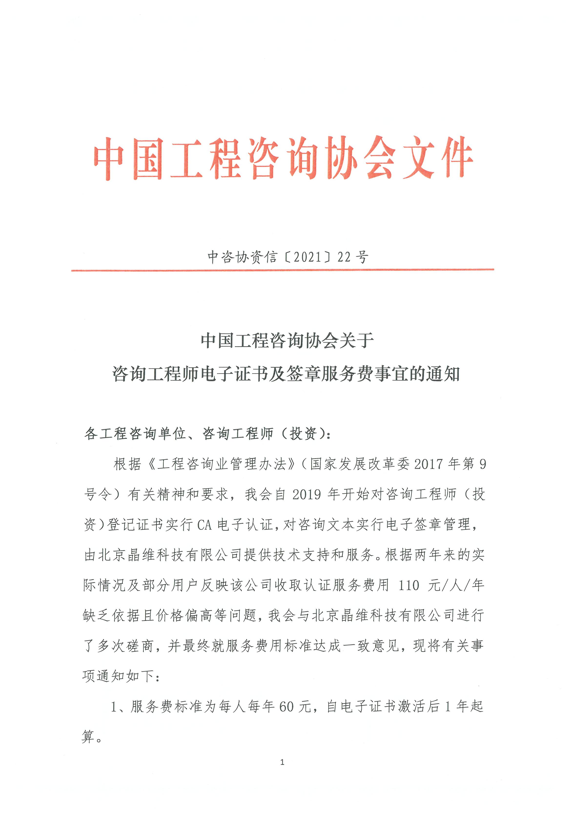 中国工程咨询协会关于咨询工程师电子证书及签章服务费事宜的通知