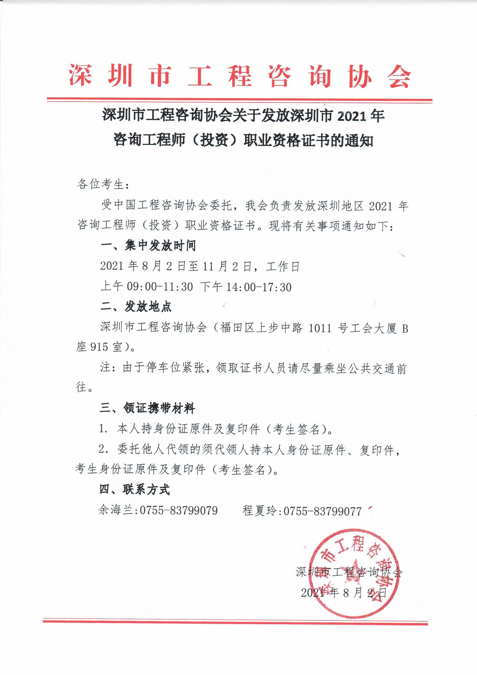 深圳市工程咨询协会关于发放深圳市2021年咨询工程师(投资)职业资格证书的通知